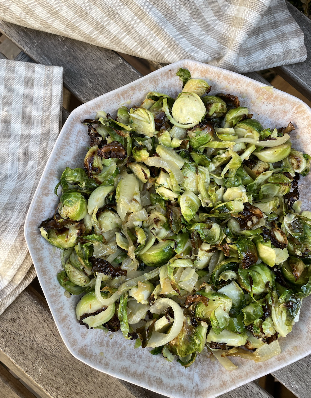 Crispy Brussels Sprouts & Caramelized Onions with a Dijon Vinaigrette