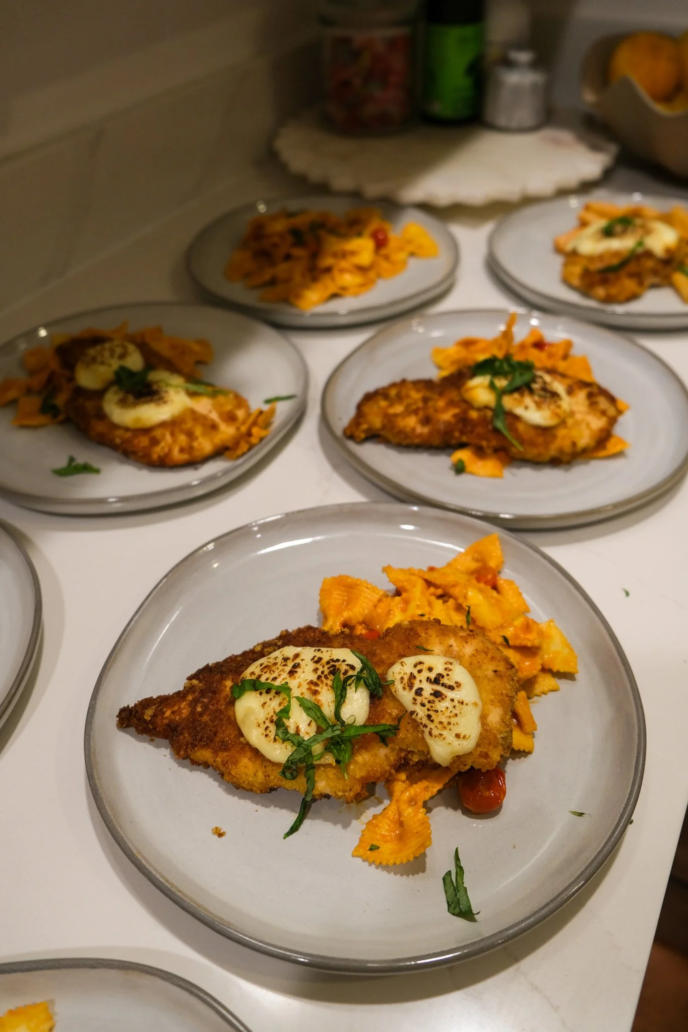 Remove the cutlets from pan, and let cool for 5 minutes. Add the chicken to a baking tray and 1-2 slices of fresh mozzarella on top of the chicken. Bake at 375 for 15 minutes. Broil for 3-5 minutes until the cheese is bubbling and crispy. Side note - instead of broiling, I used a blow torch.